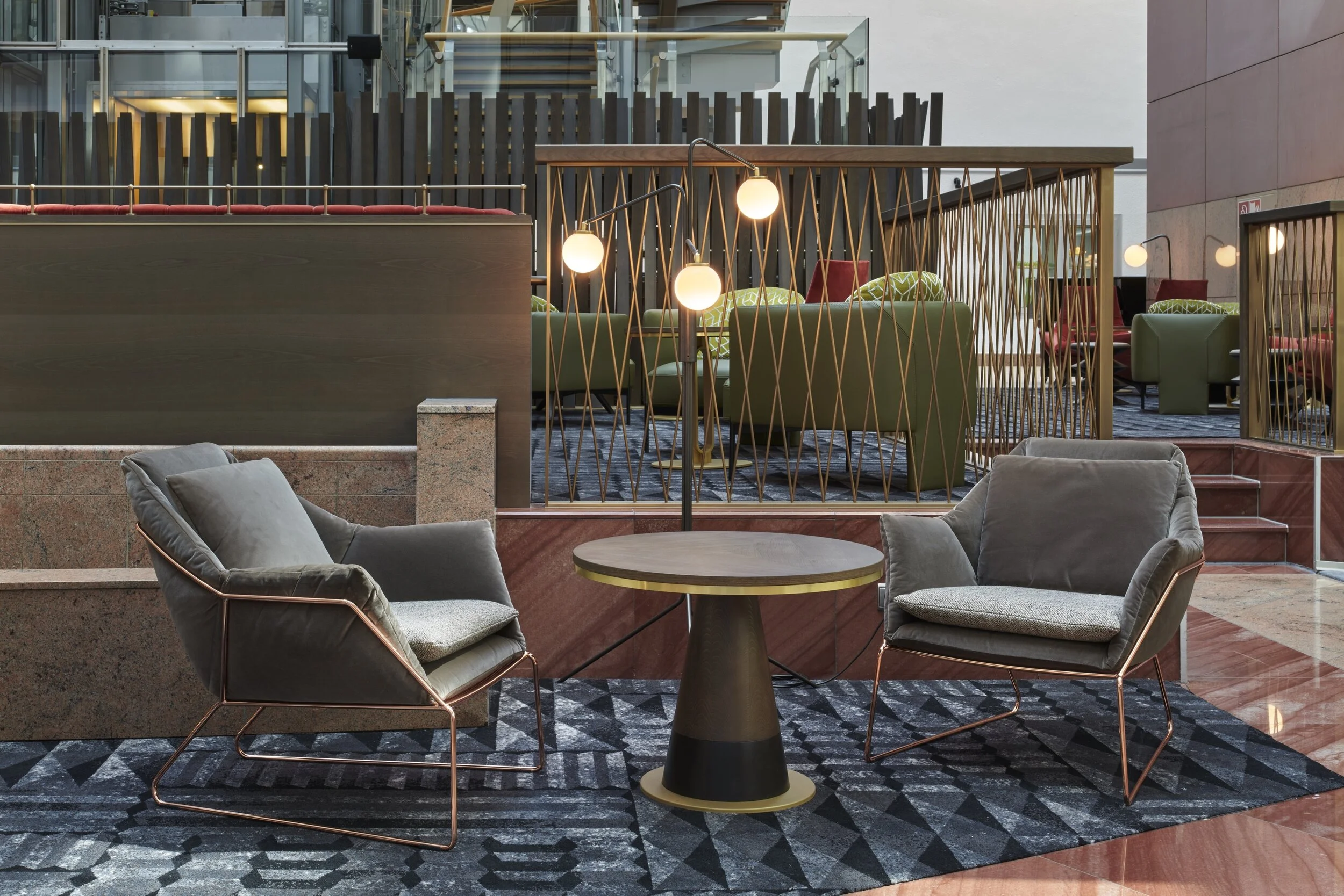 The overall style has a sense of heritage, with a focus on natural leathers, elegant veneers, Verde Alpi Marble, and brass. The colours are strong and invigorating with only 3 or 4 colours used to dress the interior.